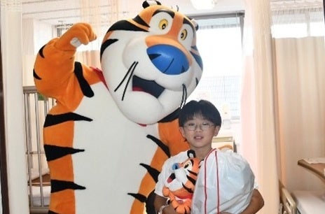 「スペシャル応援パック」には、キープ・スマイリングの「付き添い生活応援パックライト」とケロッグの手軽で栄養バランス満点のシリアル、入院中の子供たち向けにケロッグオリジナルのお絵かきノートと色鉛筆をセット。贈呈式当日は、ケロッグの代名詞ともいえる「トニー・ザ・タイガー」も病院を訪れ、子どもたちにプレゼントを手渡しました。