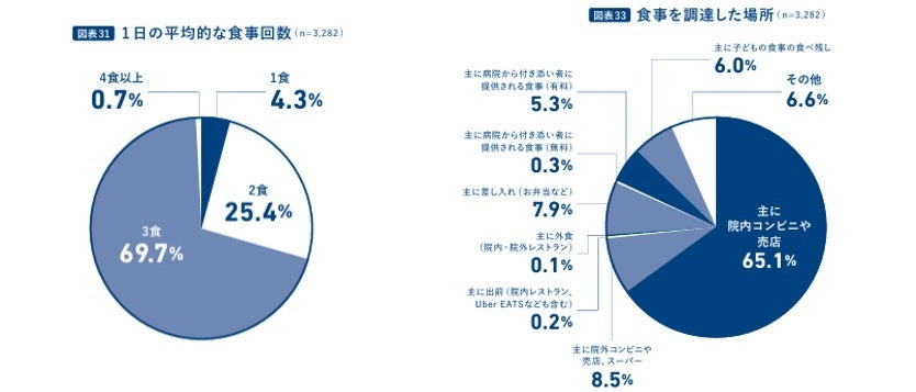 同調査では、「1日2食しか食べられていない」と回答した付き添い家族が4人に1人にのぼり、3食取れない理由として「食べる時間がない」「節約のために食費を削った」「病室が飲食禁止で子どものそばを離れられない」といった声が寄せられました。また、食事の調達手段としては「院内コンビニや売店」が65.1%と最多であり、実際に摂っている食事内容は「パン」や「弁当」「コンビニ食」など、調理不要で手軽に食べられるものが中心であることが分かっています。