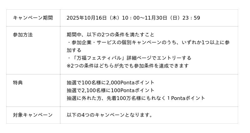 共通ポイントサービス「Ponta(ポンタ)」を運営する株式会社ロイヤリティ マーケティング(本社:東京都渋谷区、代表取締役社長:勝 文彦、以下「LM」)はPonta提携社・サービスとともに、2025年10月16日(木)~11月30日(日)に合同企画「万福フェスティバル」を開催します。