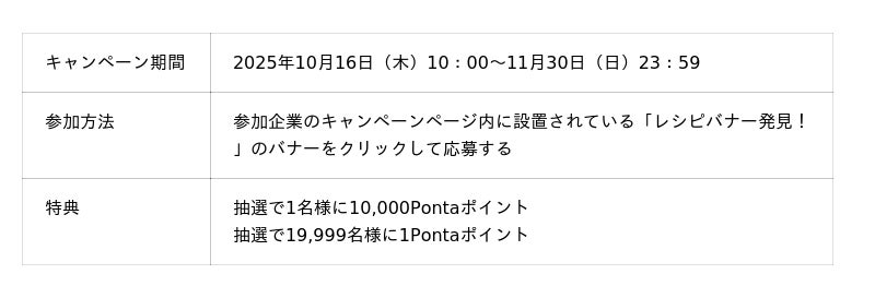今回の「万福フェスティバル」では期間中、3つの企画を行い、総額150万Pontaポイントをプレゼントします。1つ目の企画として、万福フェスティバルのキャンペーンページでエントリーと参加企業・サービスの個別キャンペーンに参加した方に、抽選で最大2,000Pontaポイントをプレゼントします。抽選に外れた方には先着100万名様に1Pontaポイントをプレゼントします。2つ目の企画では、参加企業のキャンペーンページ内に設置された「レシピバナー」を探し出し、バナーをクリックして応募した方の中から抽選で最大10,000Pontaポイントをプレゼントします。