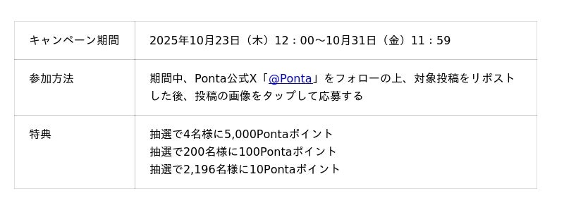 さらに3つ目の企画は、10月23日(木)~10月31日(金)に実施します。Ponta公式Xをフォローの上、対象投稿をリポストした後、投稿の画像をタップして応募した方の中から抽選で最大5,000Pontaポイントをプレゼントする企画を実施します。