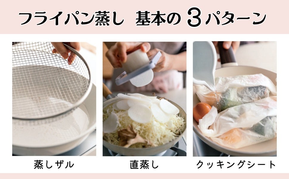 ▲ザルにのせて蒸す「蒸しザル」、フライパンに直接材料を入れて蒸す「直蒸し」、敷いたり包んだりして蒸す「クッキングシート」の3種の蒸し方を紹介しています。