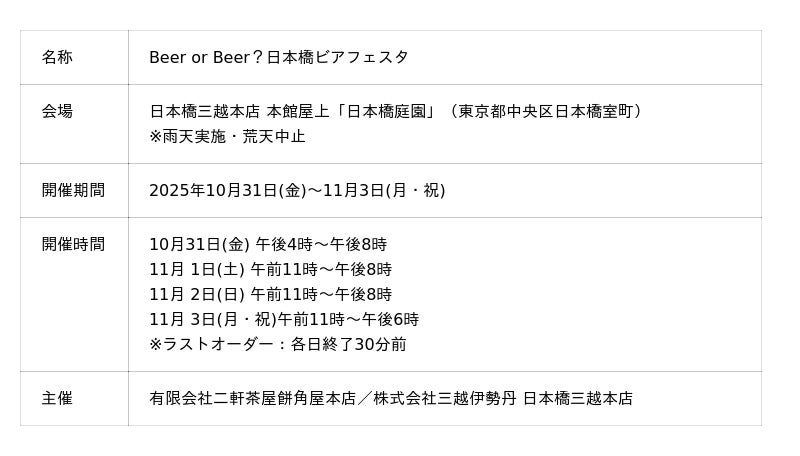 日本橋三越本店では、本館屋上「日本橋庭園」にて、注目のクラフトブルワリーが集うビアフェスティバル「Beer or Beer?日本橋ビアフェスタ」を2025年10月31日(金)から11月3日(月・祝)の4日間にわたり開催いたします。昨年の好評を受け、参加ブルワリー数を拡大し、全11ブルワリーのクラフトビール約50種類をラインナップ。ビールに合うこだわりのフード、音楽ライブなど、多彩なコンテンツで特別な体験を提供します。