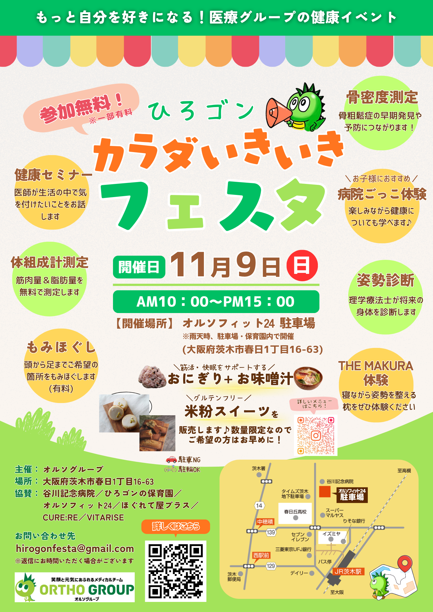 地域の皆さまの健康づくりを応援するイベント「ひろごんカラダいきいきフェスタ」を、2025年11月9日(日)に大阪府茨木市のオルソフィット24茨木店駐車場にて開催いたします。