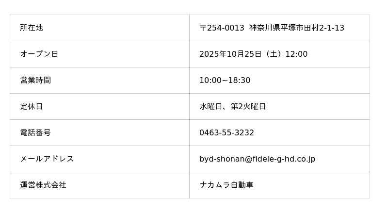 BYDの日本法人であるBYD Auto Japan株式会社(本社:神奈川県横浜市、代表取締役社長:東福寺 厚樹、略称:BAJ)の正規ディーラーである株式会社ナカムラ自動車(本社:鹿児島県鹿児島市、代表取締役社長:中村 大輔)は、2025年10月25日(土)12時に、全国で47店舗目となるショールームを備えた正規ディーラー店舗「BYD AUTO 湘南」をオープンします。