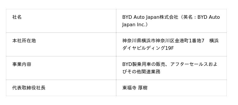 BYDの日本法人 BYD JAPAN株式会社の100%出資子会社として設立したBYD Auto Japanは、日本でのBYD製乗用車の販売およびサービスを専業に行う会社です。