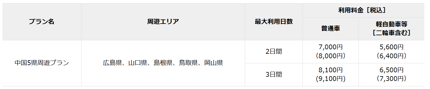 ※()内は、現在販売中のぶらり中国ドライブパスの料金