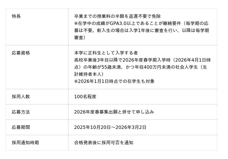 ・年収400万円未満の社会人学生を対象に、卒業まで授業料半額を返還不要で免除