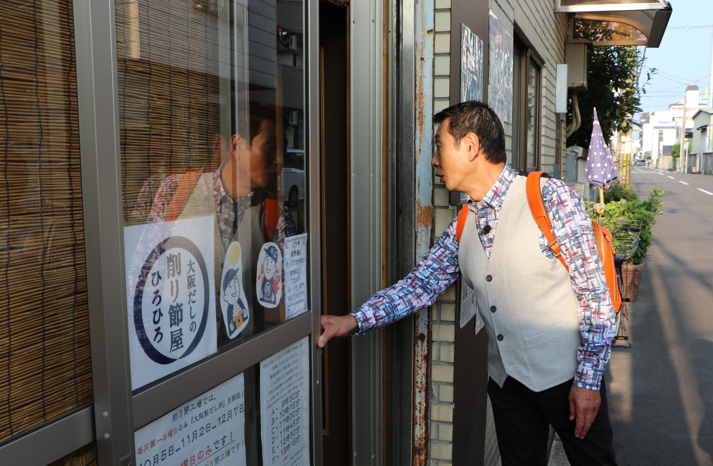 さらに街を散策していると出汁の香りが!【大阪だしの削り節加工場ひろひろ】におじゃまします。業務用削り節から家庭用の出汁までを販売されていて、なんとオーダーメードの削り節も作ってもらえるそうで、