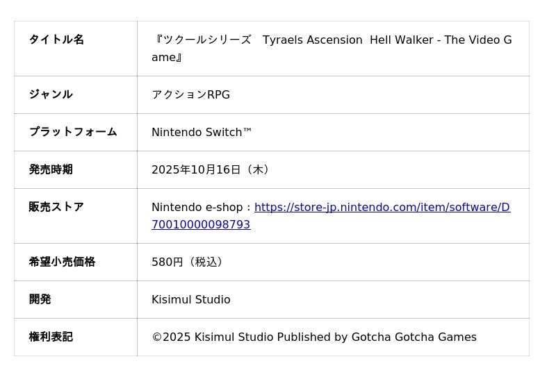 このたび、株式会社KADOKAWAのグループ会社である株式会社Gotcha Gotcha Games(本社:東京都千代田区、代表取締役社長:成田聖)より、2025年10月16日(木)に、『ツクールシリーズ Tyraels Ascension Hell Walker - The Video Game』をニンテンドーeショップにて発売させていただきましたこと、及び発売記念セールを開催することをお知らせいたします。