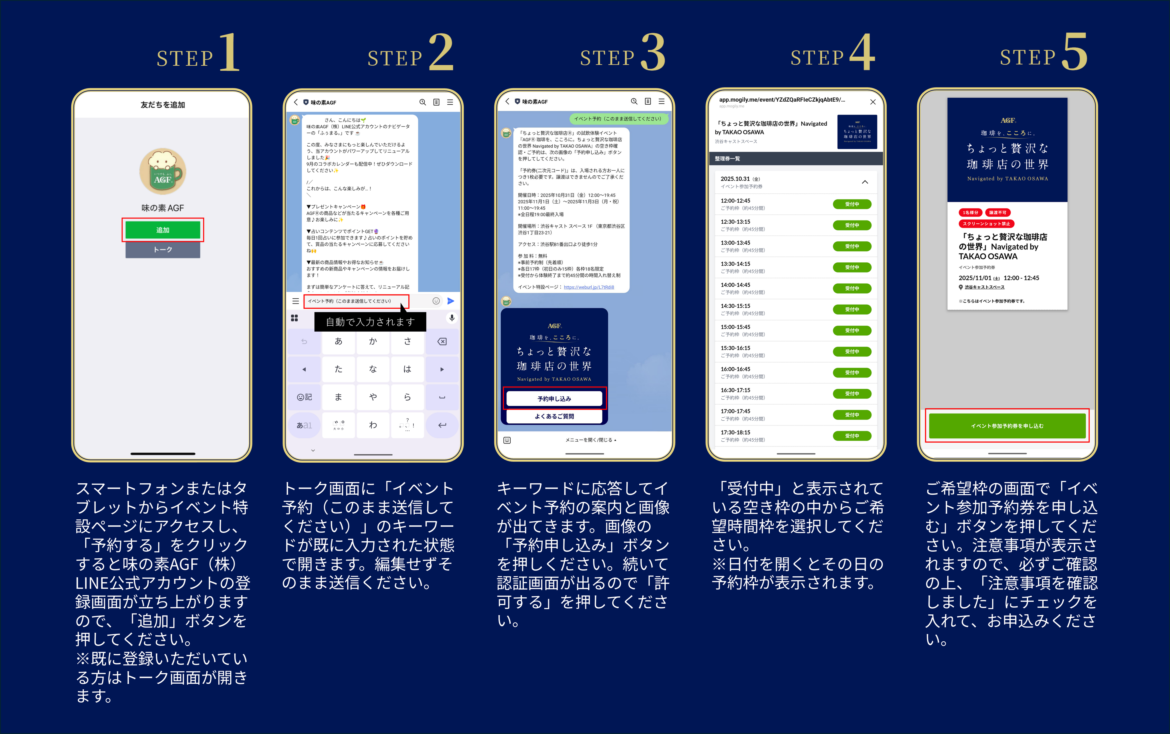 ・予約時間の5分前になると味の素AGF(株)LINE公式アカウントから通知が届きます。予約時間になりましたら受付にて「予約券」をご提示ください。