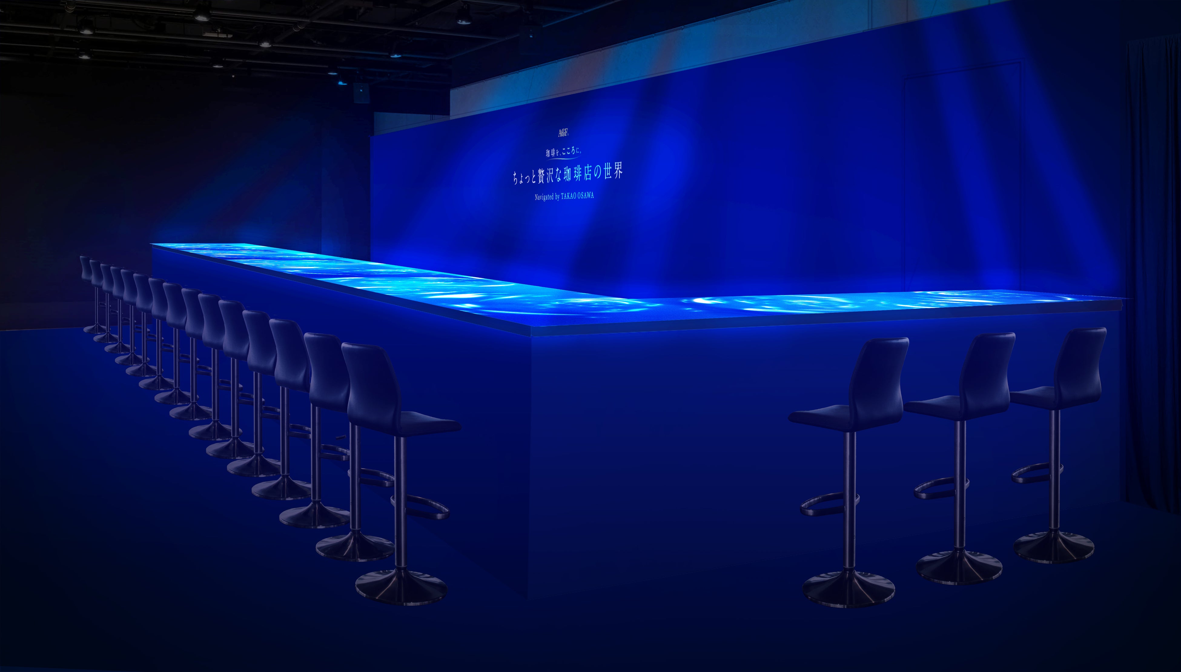 「ちょっと贅沢な珈琲店(R)」の新TVCMと同じ、深い青の世界をプロジェクションマッピングで表現した特別な空間へご案内します。テーブルには、ゆらめきや光が投影され、ゆっくりと落ち着いた空間から体験が始まります。日頃から珈琲を愛飲されている大沢たかおさんによる、本イベント限定の録り下ろしナレー ションとともに、目の前でバリスタが淹れる「ちょっと贅沢な珈琲店(R)」レギュラーコーヒーを五感で愉しみながら、“こころの余白”を感じる特別なひとときを体験いただけます。