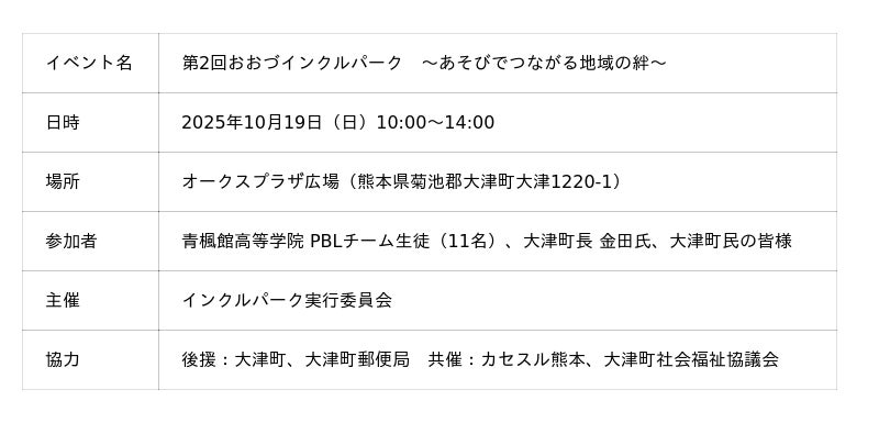 青楓館高等学院(本校:兵庫県明石市、代表:岡内大晟)の生徒は、10月19日(日)に熊本県大津町にて、地域住民を巻き込んだインクルーシブなまちづくりイベントを実施します。