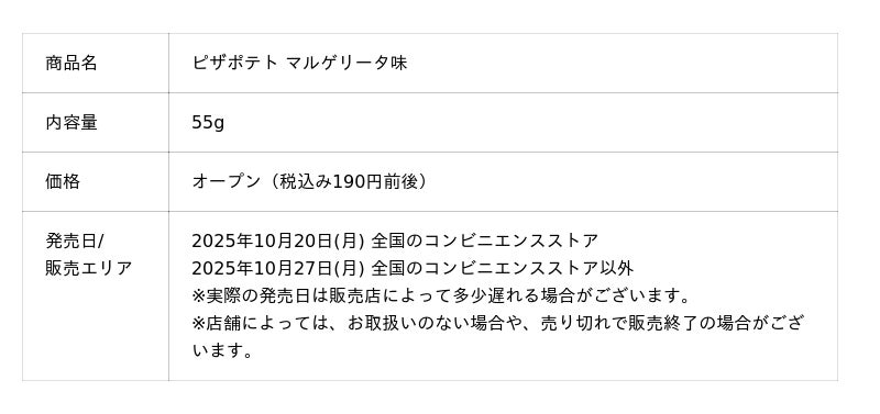 カルビー株式会社(本社:東京都千代田区、代表取締役社長兼CEO:江原 信)は、濃厚とろ~りチーズとスパイスが効いたピザソースがくせになる厚切りポテトチップス「ピザポテト」シリーズより、株式会社フォーシーズ(本社:東京都港区、代表取締役会長兼CEO:淺野 幸子)が展開する宅配ピザ「PIZZA-LA」(ピザーラ)の人気メニューの味わいを再現した『ピザポテト マルゲリータ味』を2025年10月20日(月)から全国のコンビニエンスストア先行で期間限定発売します。コンビニエンスストア以外の店舗では、2025年10月27日(月)から発売(2026年6月下旬終売予定)。