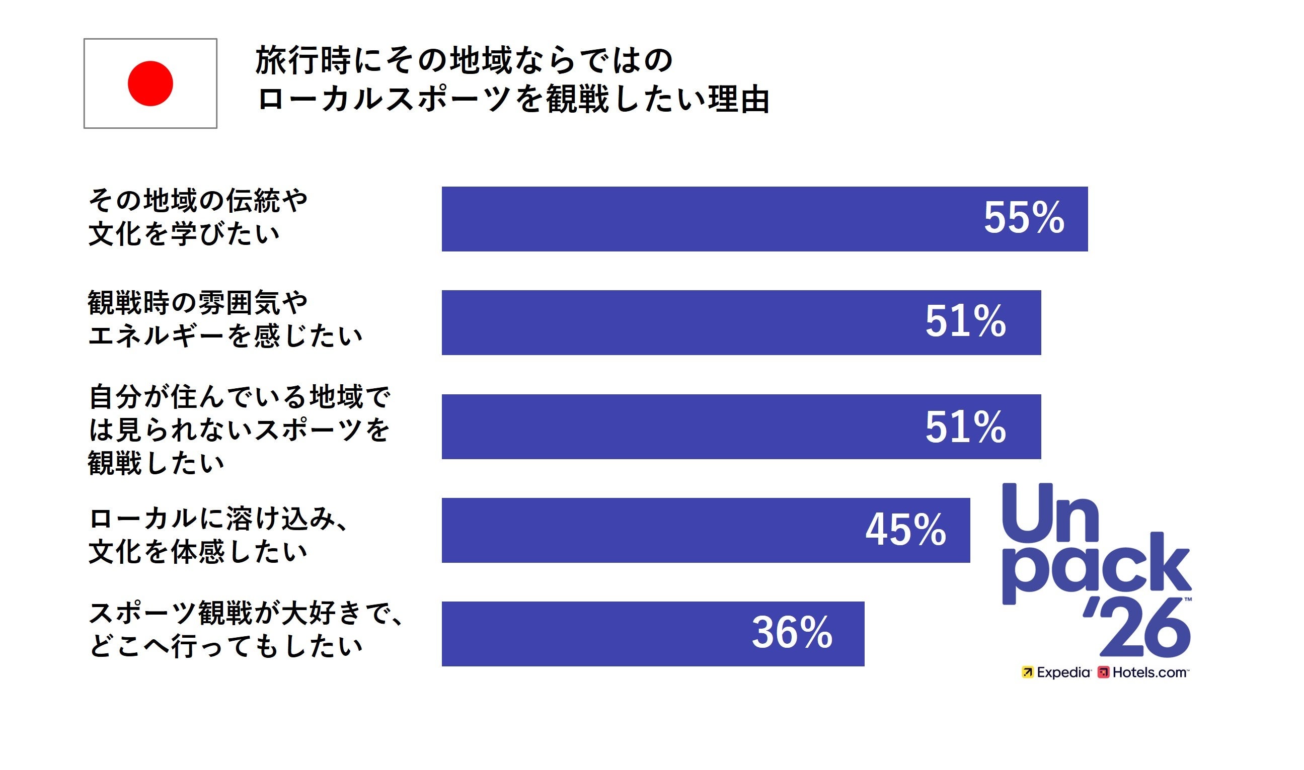 また、旅行時にその地域ならではのローカルスポーツを観戦したい理由について、日本人の旅行者は、「その地域の伝統や文化を学びたい(55%)」が最も多く、次いで「観戦時の雰囲気やエネルギーを感じたい(51%)」「自分が住んでいる地域では見られないスポーツを観戦したい(51%)」という回答が続きました。日本人はスポーツそのものだけでなく、その地域のコミュニティや文化に触れ、地元の人々の日常を体験する旅を求めている様子がうかがえます。