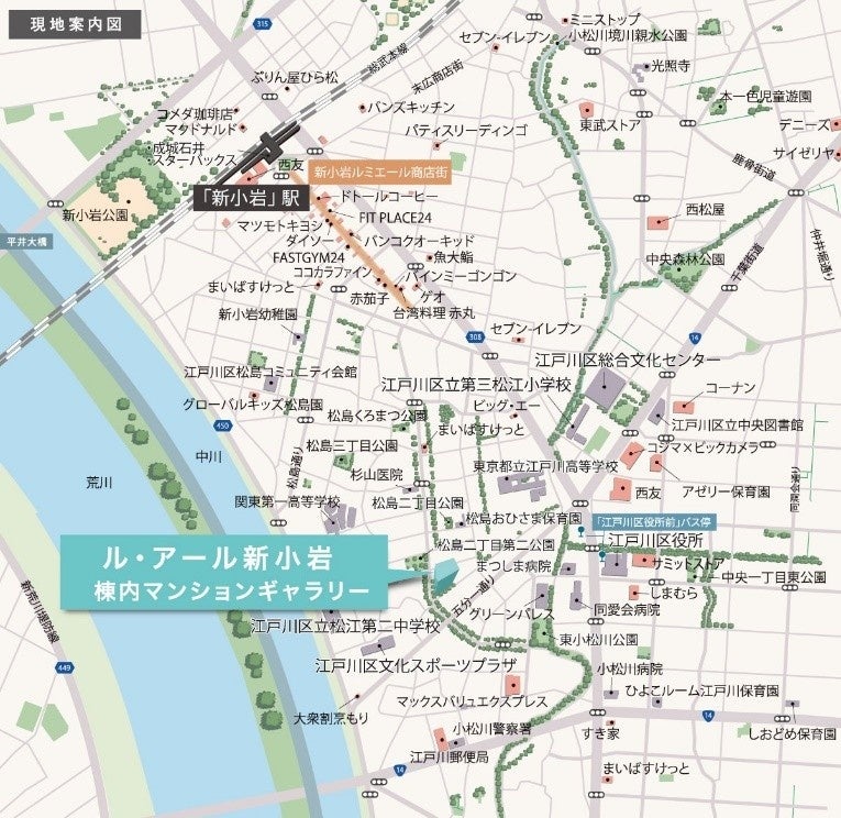 周辺には公園が点在しており、緑豊かなロケーションです。「新小岩」駅との間には約420mにもおよぶ新小岩ルミエール商店街があり、日用雑貨や食料品販売、飲食店など、日常的に利用できる店舗が立ち並びます。