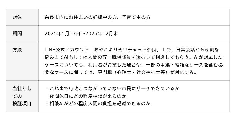 奈良市とつながりAI株式会社・認定NPO法人フローレンスが実証実験として運用する「おやこよりそいチャット奈良」は、導入後の運用実績分析により、相談の85%をAI、15%は相談員が対応。AIが多くの利用者に初期対応や情報提供を実施できた一方、人との相談を希望する利用者や一部の重篤・複雑なケースについては相談員による迅速な介入と継続支援が必要であり、AIと人によるハイブリッドでの相談支援体制が不可欠であることが明らかになりました。