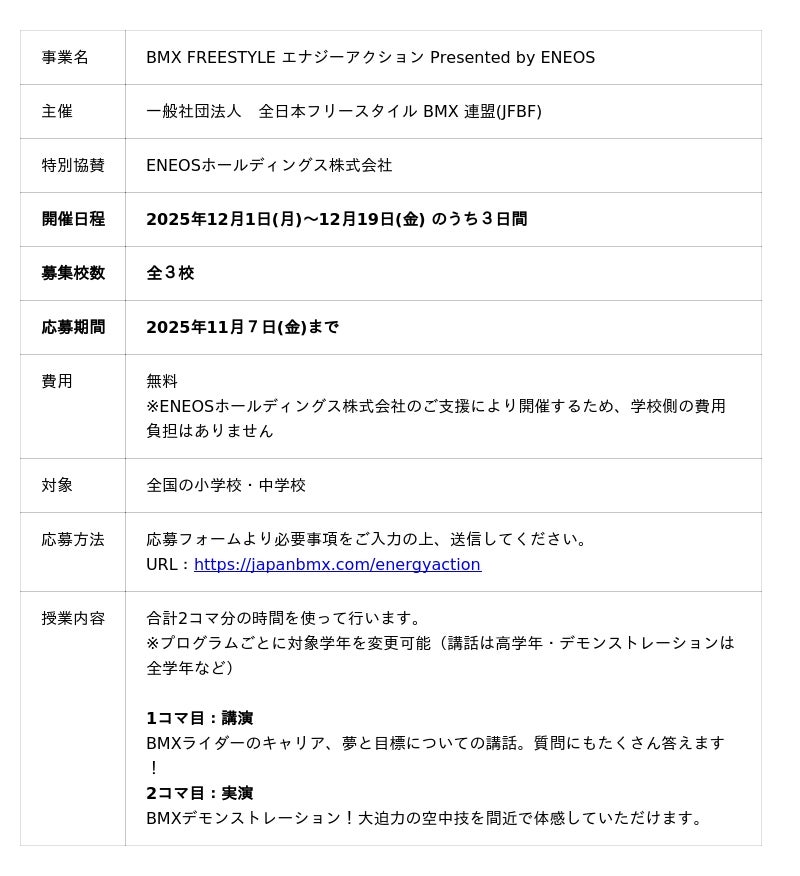 全日本フリースタイルBMX連盟(理事長:出口智嗣)は、五輪種目「BMXフリースタイル」の日本を代表するライダーらを小中学校へ派遣し、講演やパフォーマンスを通じて競技やライダーの魅力を発信する特別授業「BMX FREESTYLE エナジーアクション Presented by ENEOS」を、今年も全国小中学校からの公募により開催します。注目のコンテンツはジャンプ台を持ち込み間近で空中トリックを披露するデモンストレーションで、全3校を訪問します。本企画は2023年度にスタートし、大好評につき本年も開催が決定。開催は12月を予定しており、開催希望校の募集受付は11月7日まで行います。