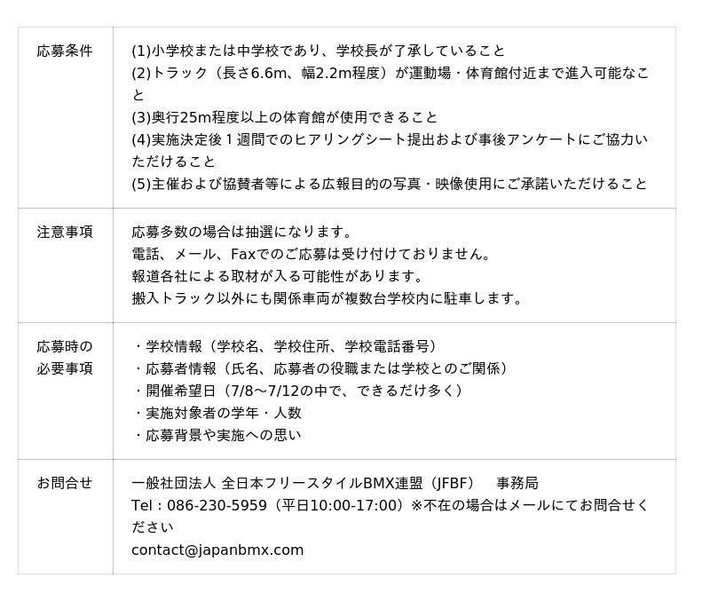 全国の小中学校を対象に3校募集! BMXフリースタイルの日本を代表するライダーらによる講演・パフォーマンスを届けるプロジェクト。