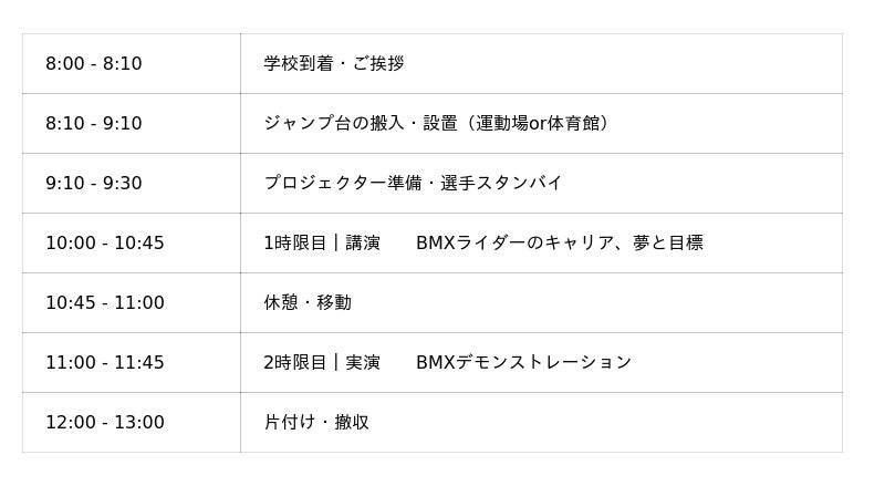 東京2020オリンピックから正式種目になったアーバンスポーツの一種「BMXフリースタイル」の世界で活躍中の日本を代表するBMXライダーがあなたの学校を訪問!BMXという特殊なキャリアを選択し最前線で戦っているライダーの生き方や夢・目標に迫る授業と、ジャンプ台を使った空中トリックが生でみられる特別授業。普段の生活で味わうことのできないBMXならではの刺激が満載!BMXで心に残る1日を、ぜひあなたの学校で。