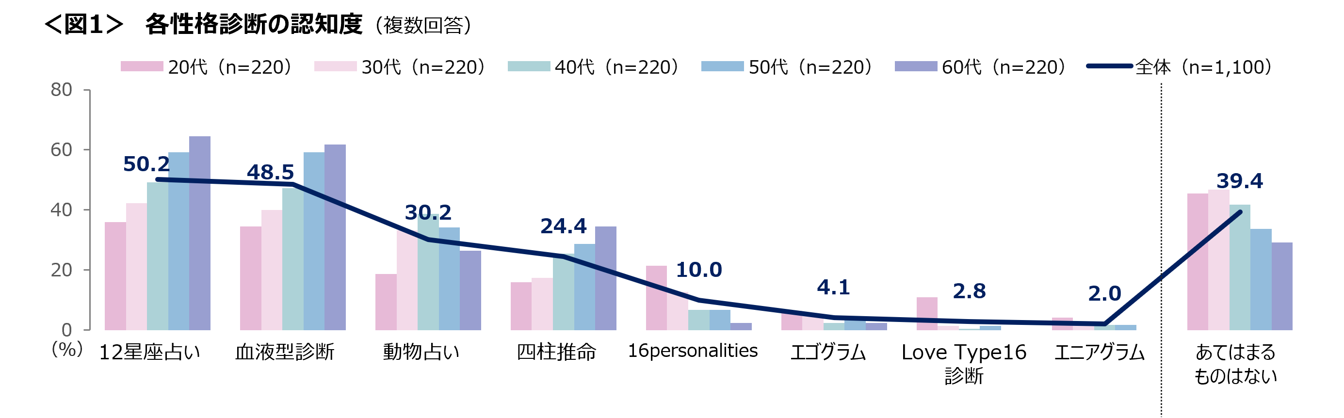 「12星座占い」「血液型診断」「四柱推命」は年代が上がるほど認知率も高まる。20代は「16personalities」「Love Type16診断」が高い。<図1>
