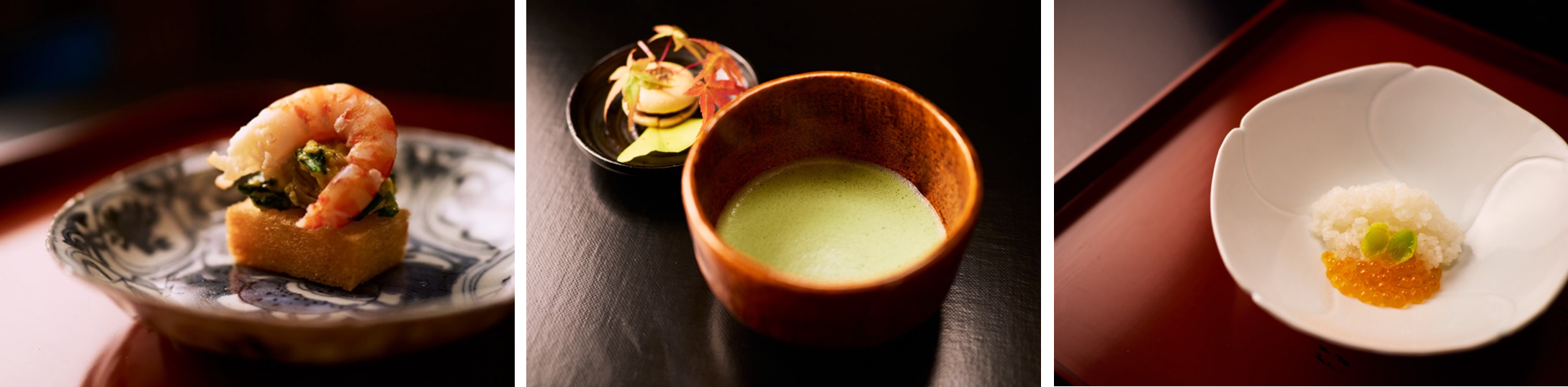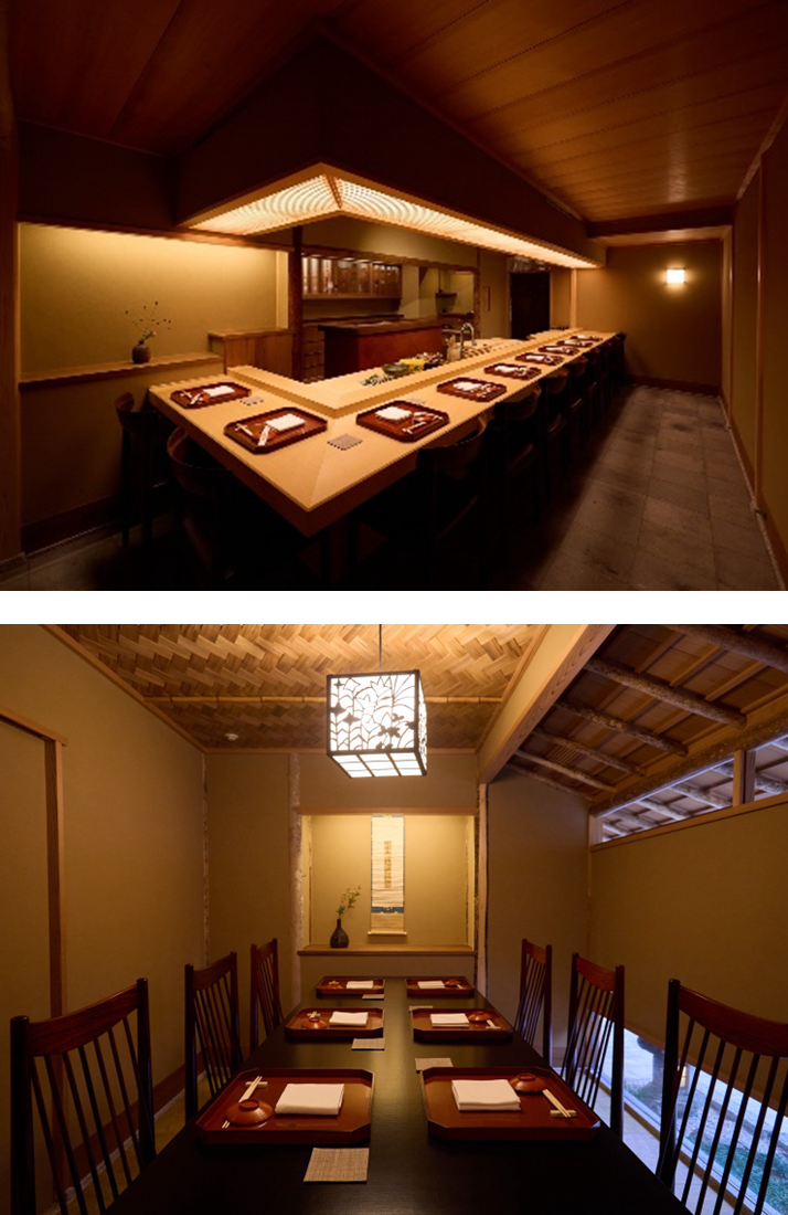 京都にて数寄屋建築を研ぎ澄ましてきた職方の手により、古材や時を経た石を用いた、唯一無二の空間となっています。茶の湯の精神に通ずる「侘び寂び」と「用の美」を基調としたしつらえの中で、 移ろう季節を一皿ずつ丁寧に映してまいります。