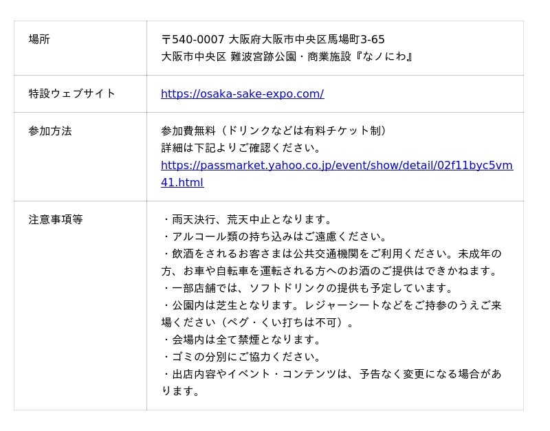 NTT都市開発株式会社(本社:東京都千代田区、代表取締役社長 池田 康)は、大阪市中央区の難波宮跡公園および隣接する商業施設『なノにわ』において、大阪ブルワーズ協会、大阪ワイナリー協会、大阪酒造組合に所属する酒類製造事業者と合同で、「大阪酒万博2025 in なノにわ」を2025年10月18日(土)・19日(日)に開催することをお知らせします。