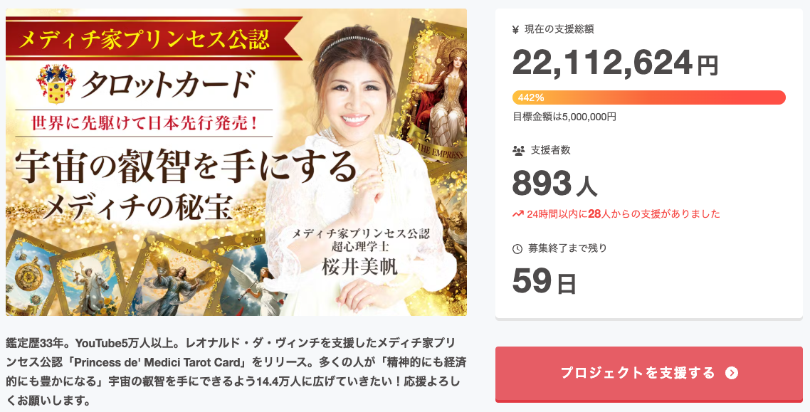 メディチ家プリンセス公認のタロットカードプロジェクトが、開始からわずか2日で支援者650名・支援金額2,000万円を突破しました。