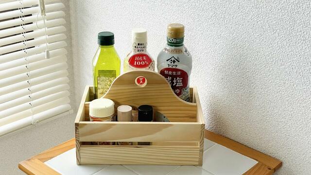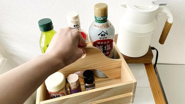 調味料もまるっとここに収納しておけば、戸棚に入れていても、料理をするときに丸ごと移動がしやすいです。