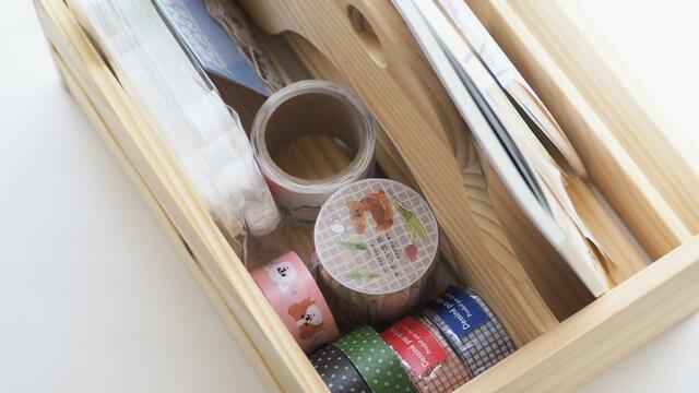 メッセージカードや、手帳をデコレーションするときに使うマスキングテープ、シールなどを入れたりしています。