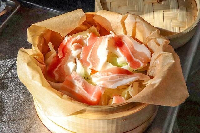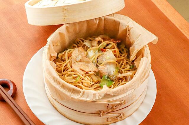 特に気に入っているのが「焼きそば」ならぬ「蒸しそば」! キッチンシートを敷いてから、市販の焼きそば麺・野菜・お肉の順番で材料を入れたら準備OK。