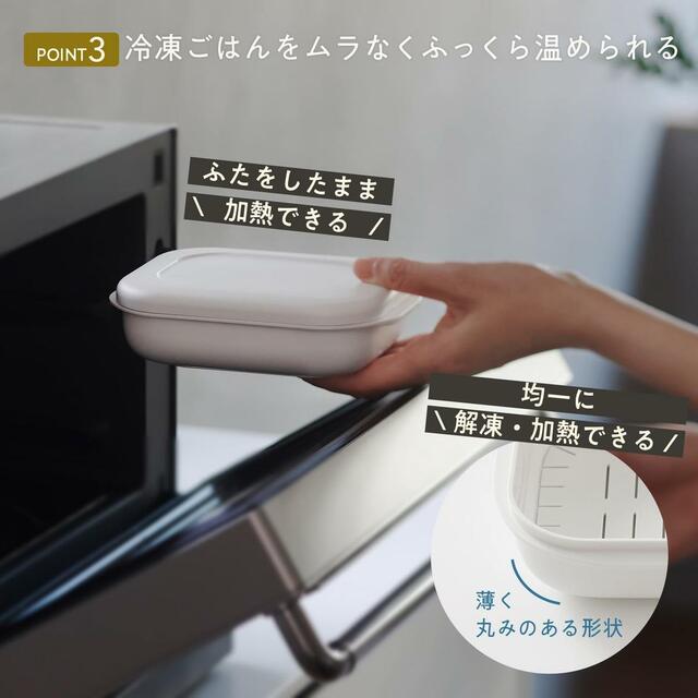 本商品は、ごはんをふっくらおいしく解凍できる設計が特長。すのこパーツで余分な水分が下に落ちてご飯のべたつきを防ぎ、薄く丸みのある形状でムラなく加熱できるので、まるで炊き立てのような食感がよみがえります。
