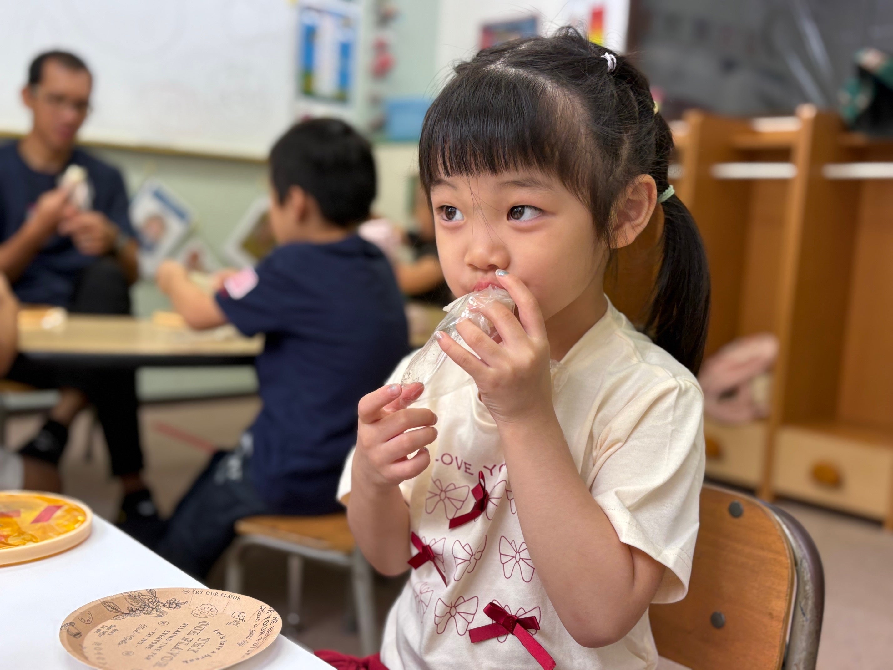 今回は、愛知県ならではのしずく型 (里芋型) のお月見団子を味わいました。「丸ではなく、しずく型なのはなぜ?」という英語での会話から、地域ごとの風習の違いにも興味が広がりました。ほんのり甘くて優しい味に「美味しい~!」と大盛りあがり!子どもたちのたくさんの笑顔が見られました。