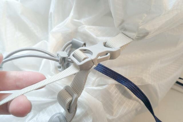 そして更に荷物が重いときには、腰部分と胸元部分のバックルをカチッとはめると、重さが肩だけでなく体全体に分散され、ぐっと荷物が軽く感じられるようになります。
