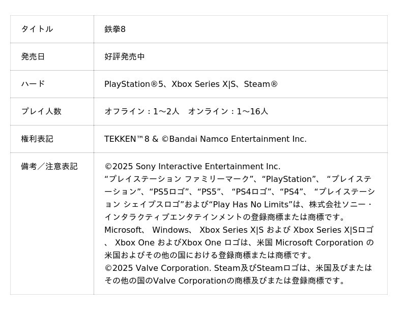 6,100万本以上の世界累計販売本数を誇る3D対戦格闘ゲーム「鉄拳」シリーズの最新作。本作では、キャラクター個々の特性が強化される「ヒート」や、オススメのアクションをワンボタンで出せる「スペシャルスタイル」などの新要素を導入。気軽にアグレッシブな対戦を楽しめる。