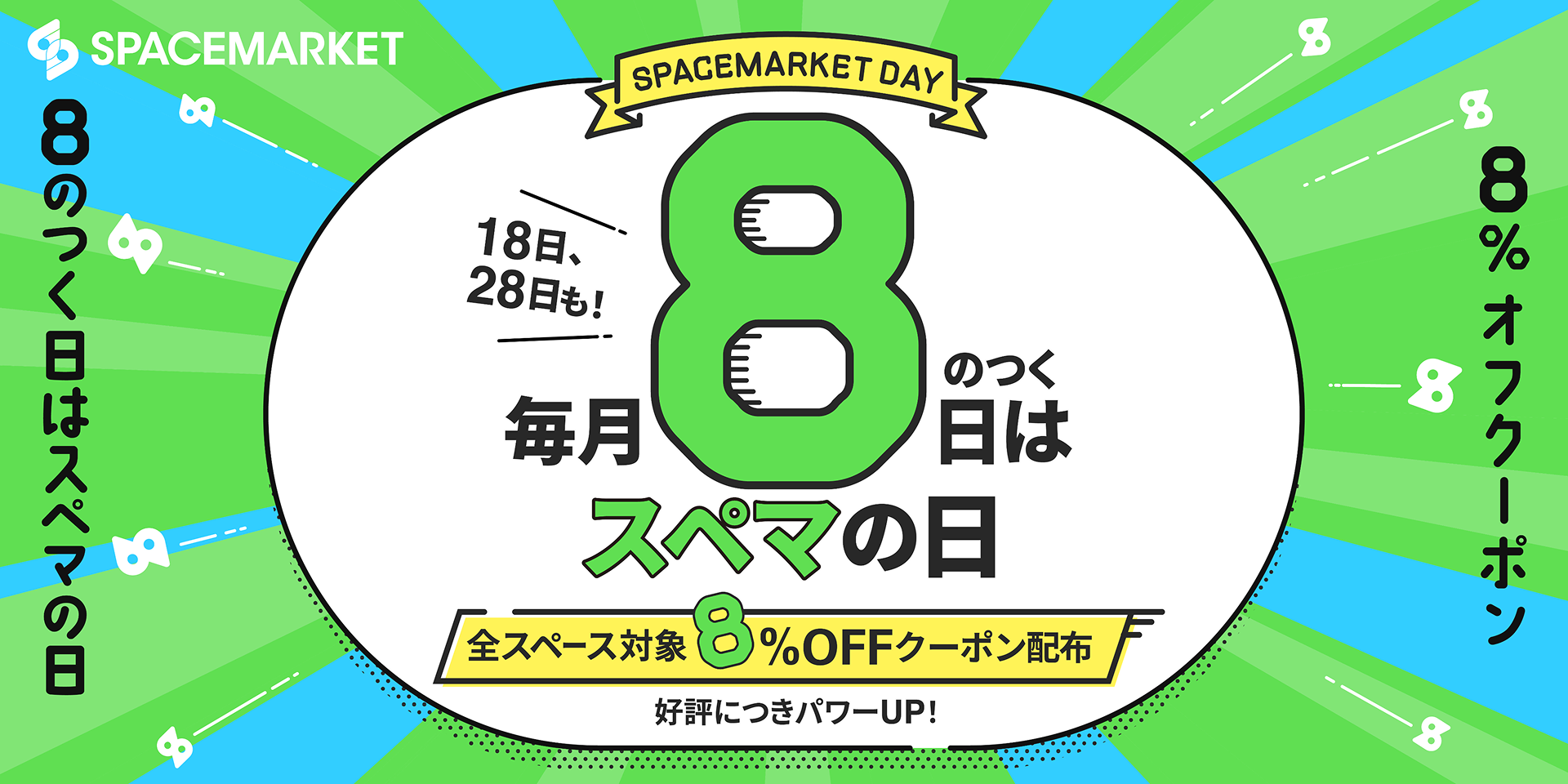 毎月8日、18日、28日に、スペースマーケットに掲載されているスペース利用で使える8%OFFクーポンを配布いたします。
