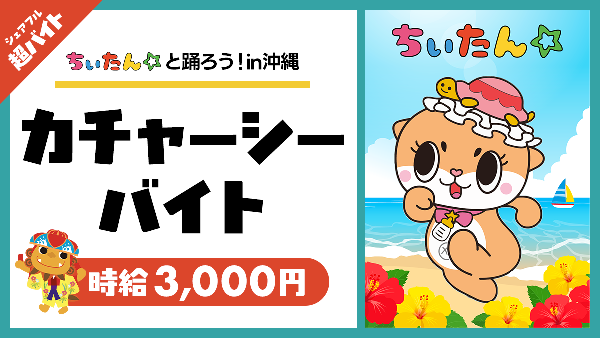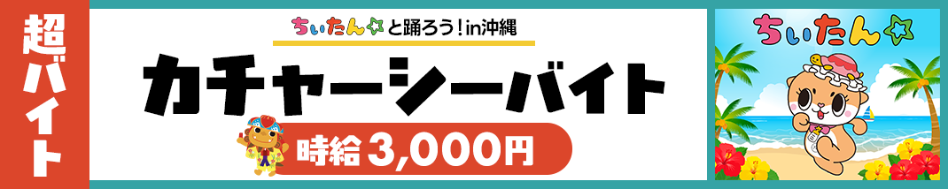 2025年10月29日(水)、ちぃたん☆とのタイアップ企画の超バイトを沖縄県にて実施します。ちぃたん☆と一緒にカチャーシー(※)を踊ったり、動画撮影を行ったりするお仕事です。ちぃたん☆ファンの方、カチャーシーが得意な方など、たくさんのご応募をお待ちしております。