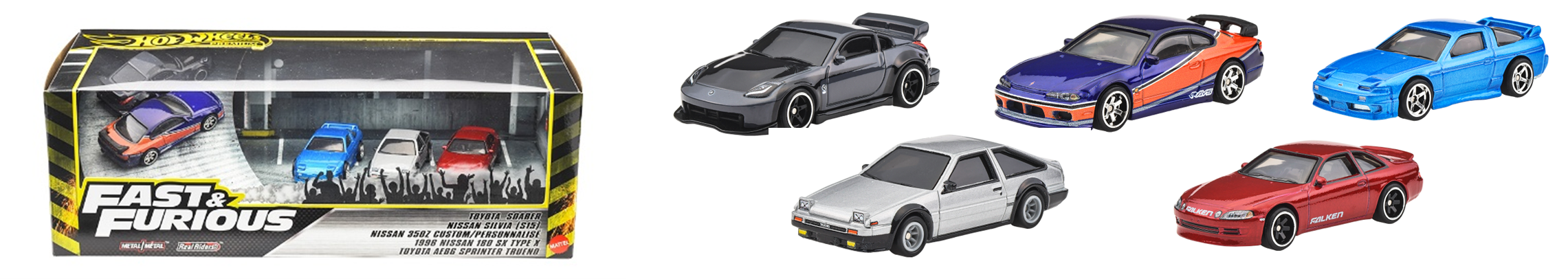 「ワイルドスピード」シリーズ第3作『ワイルド・スピードX3 TOKYO DRIFT』に登場した日本仕様の劇中車を集めた、豪華な5台セットがホットウィールから登場いたしました。日本とアメリカを舞台に展開する本作の中でも特に印象的なマシンが揃っており、映画ファン必見の内容です。