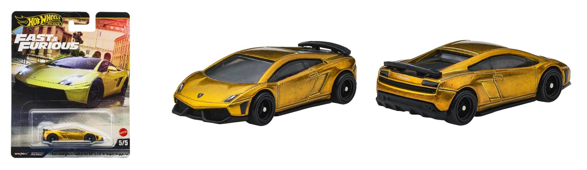 「ワイルドスピード」シリーズの第10作、『ワイルド・スピード/ファイヤーブースト』の、ローマを舞台としたシーンにおいて、ファミリーのローマンが登場するのが、金色のメッキ・ラッピングが施されたランボルギーニ・ガヤルドです。眩しいボディ色は敵の視界で乱反射し、翻弄するにも有効という設定です。ホットウィールでは後期型の高性能仕様、スーパーレッジェーラをべースに劇中車同様の彩色をジンクメッキ&カラークリア塗装で表現しています。