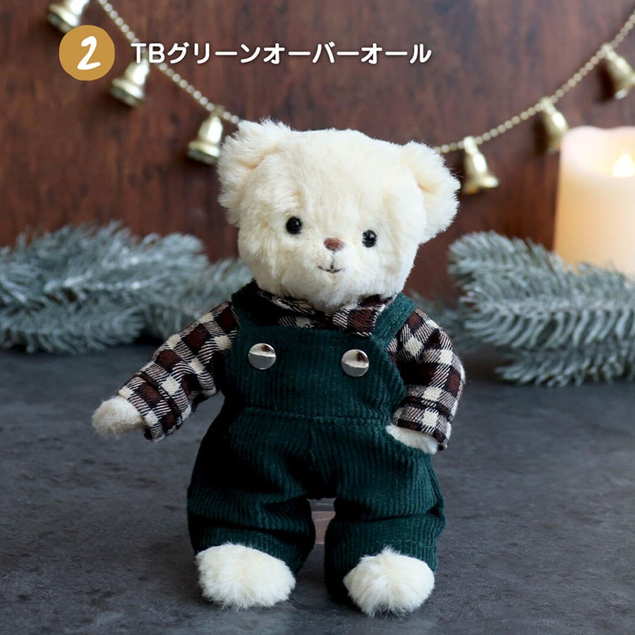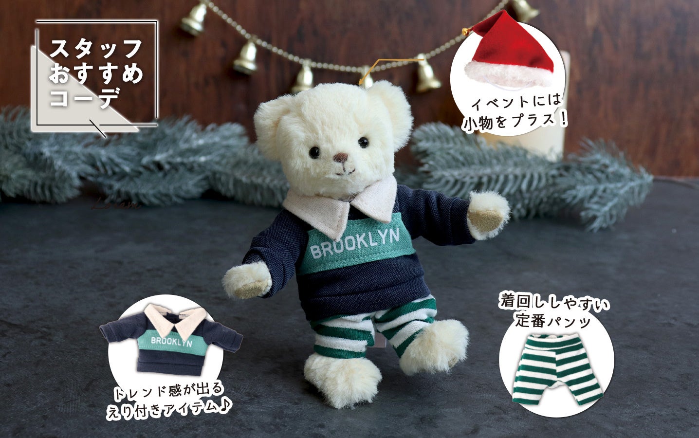 コーデュロイやチェック柄など季節感あふれる素材を取り入れた、おしゃれであたたかな全4スタイルを展開します。クリスマス気分を盛り上げるサンタ帽付きのセットも登場し、冬のテディベアライフを華やかに彩ります。