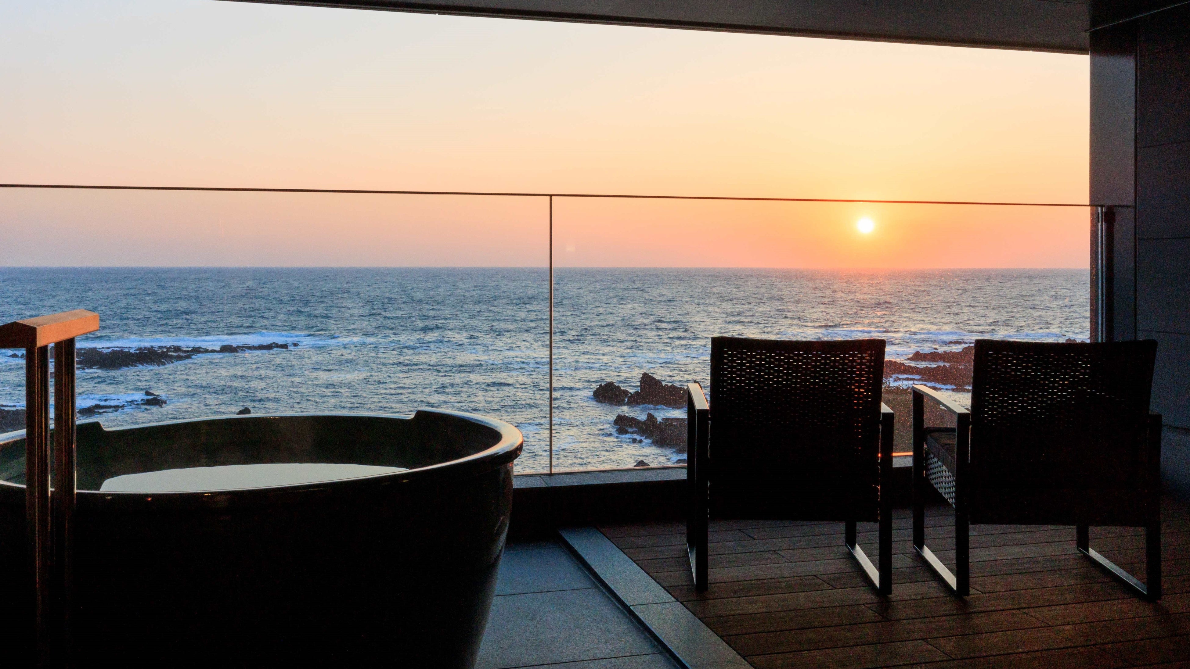 また、客室露天風呂付きのプレミアグランスイート(84m²)・プレミアスイート(67m²)・オーシャンテラススイート(約50m²)の合計14室のスイートルームでは、日本海の絶景を独占しながら、プライベートな湯浴みをお楽しみいただけます。
