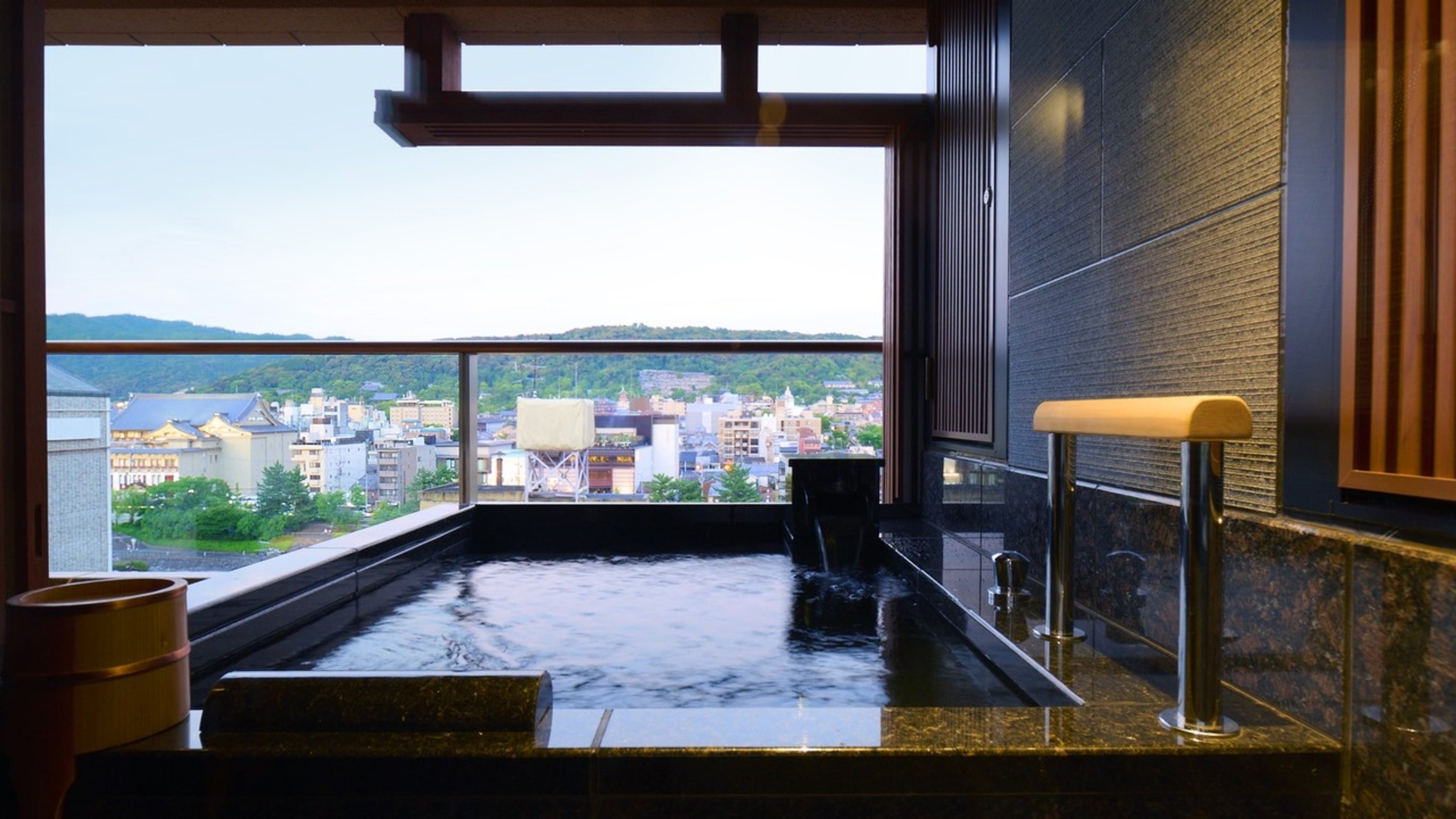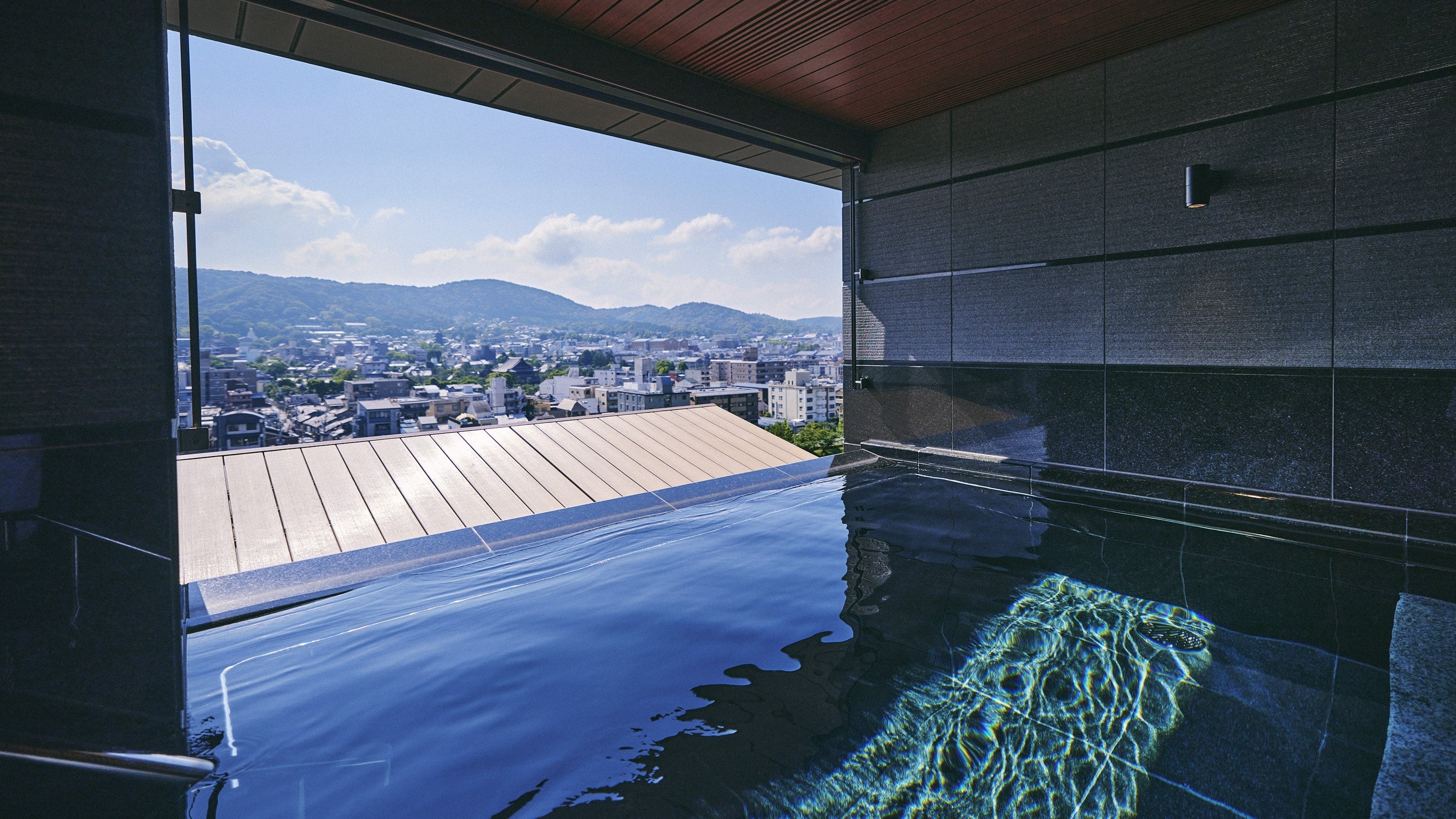 地下1,150mから汲み上げる自家源泉。塩化物イオン8,800mg、鉄イオン10mgを含む濃厚な温泉で、美肌効果が高く、肌にしっとりとした感触です。全客室に自家源泉の天然露天風呂を備えるとともに、最上階には、東山の大パノラマを望む立ち湯の「八坂の湯」と、柔らかな光に包まれた「庭の湯」の2種類の展望大浴場をご用意しています。
