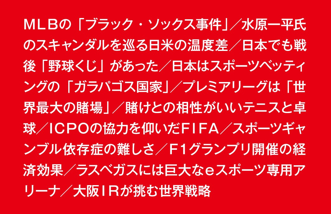本書は、賭博によって変質しているスポーツの事情、賭博やスポーツが街作りに直結しているラスベガスやシンガポールの事例の紹介、依存症対策、各種スポーツの賭博との関係など、関連する事象を網羅的に検証した一冊です。著者の相原正道氏は、スポーツビジネスの現場の経験を持つと同時に、現在は学者として関連する事象の調査・研究に携わっておられる第一人者です。類書は存在しません。こうした事象に興味をお持ちの方は、ご一読頂けましたら幸いです。
