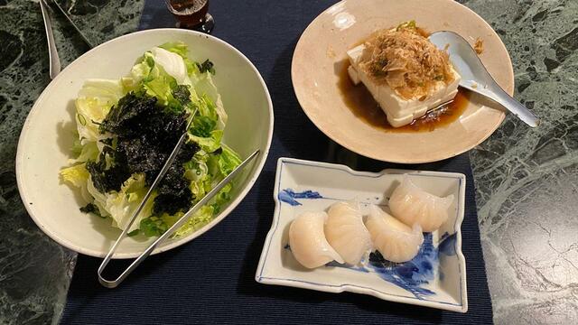 韓国海苔をかけたレタスサラダ(これって、もしかして、チョレギサラダ?)、絹豆腐、海老の蒸し餃子、