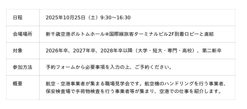 総合人材情報サービスの株式会社アイデム(東京都新宿区 代表取締役社長:椛山亮)は、北海道エアポート株式会社(北海道千歳市 代表取締役社長:山崎 雅生)が10月25日(土)に開催する職場見学会の運営をサポートいたします。