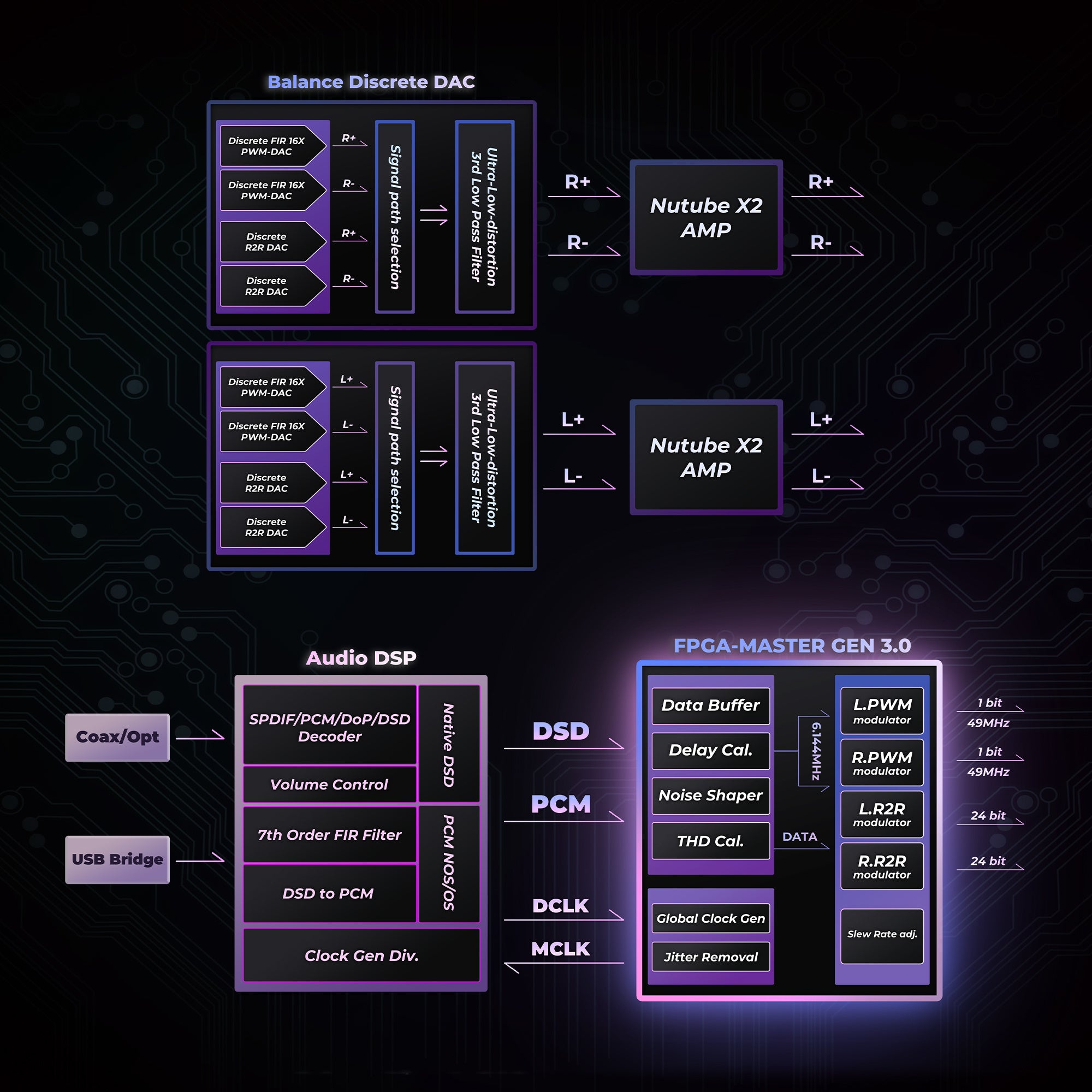 64枚のPWM-DAC1bitアーキテクチャ1bitモードでは【L+、L-、R+、R-】それぞれのチャンネルに16EのPWM-DACを備えた、合計64枚のディスクリートPWM-DAC回路を採用しています。このPWM-DAC回路群の「配線遅延」を最新のFPGA-Master3.0テクノロジーによって補正し、I/Oレイテンシが正確に制御されることで厳密にDACへと完全な同期を叶え、サウンドの緻密さと解像度を大幅に向上しています。