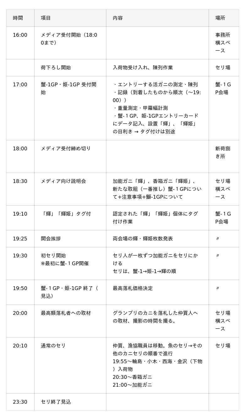 ※「蟹-1グランプリ」「姫-1グランプリ」の受付は17:00からとなりますが、カニの水揚げは16:00ごろから開始します。カニの荷卸しや漁港の様子をご取材いただく場合は、フォームにて記載の上、事務局まで事前にご連絡ください(水揚げの時間は当日の天候や漁模様により早くなる可能性があります)。