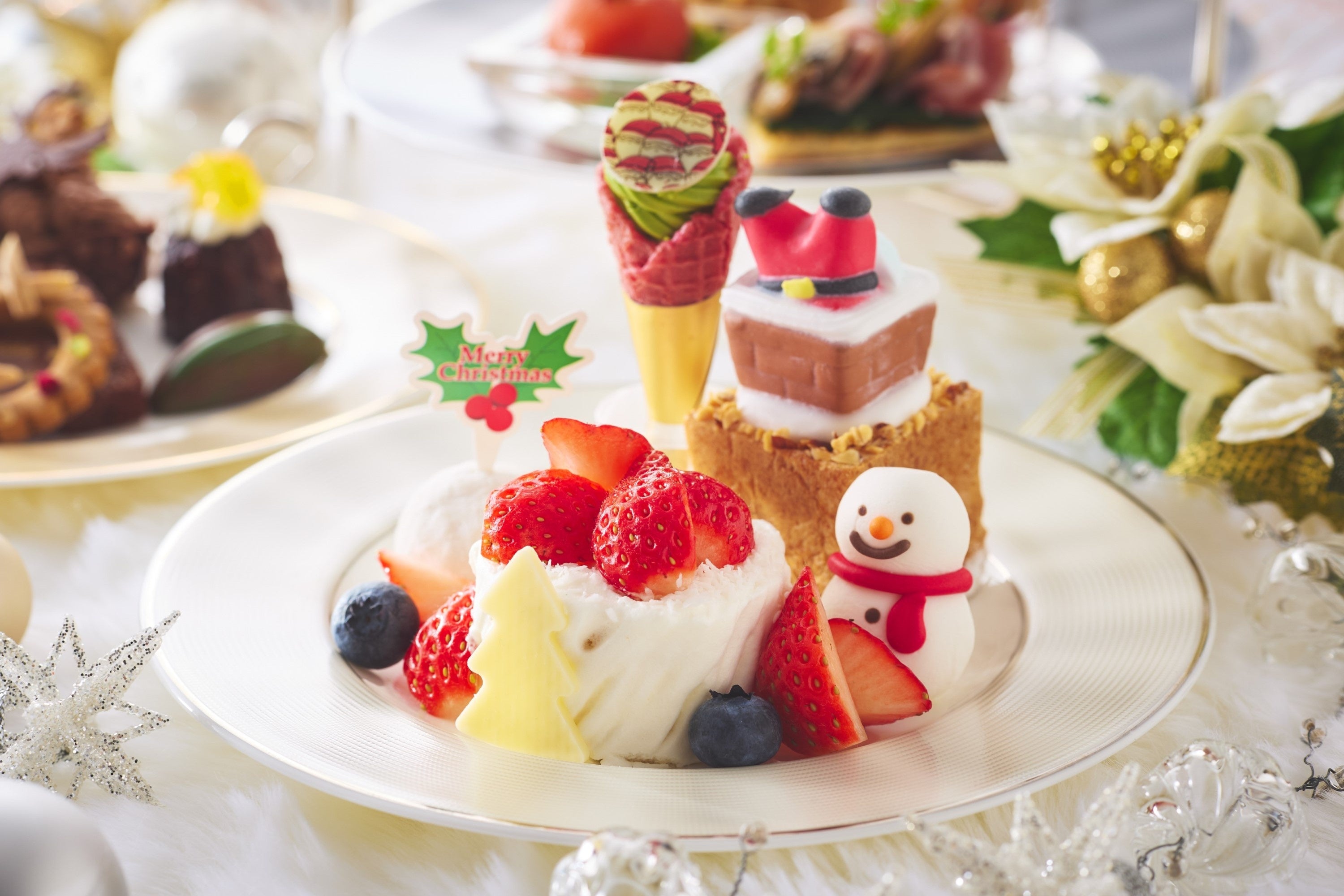 スイーツは、煙突に見立てた「バナナカスタードシュー」や、王道の「ショートケーキ」、トナカイが引くソリを想わせる「チョコレートモンブラン」、オレンジがアクセントの「紅茶のカヌレ」など、クリスマスらしいときめきを感じていただけるラインアップです。