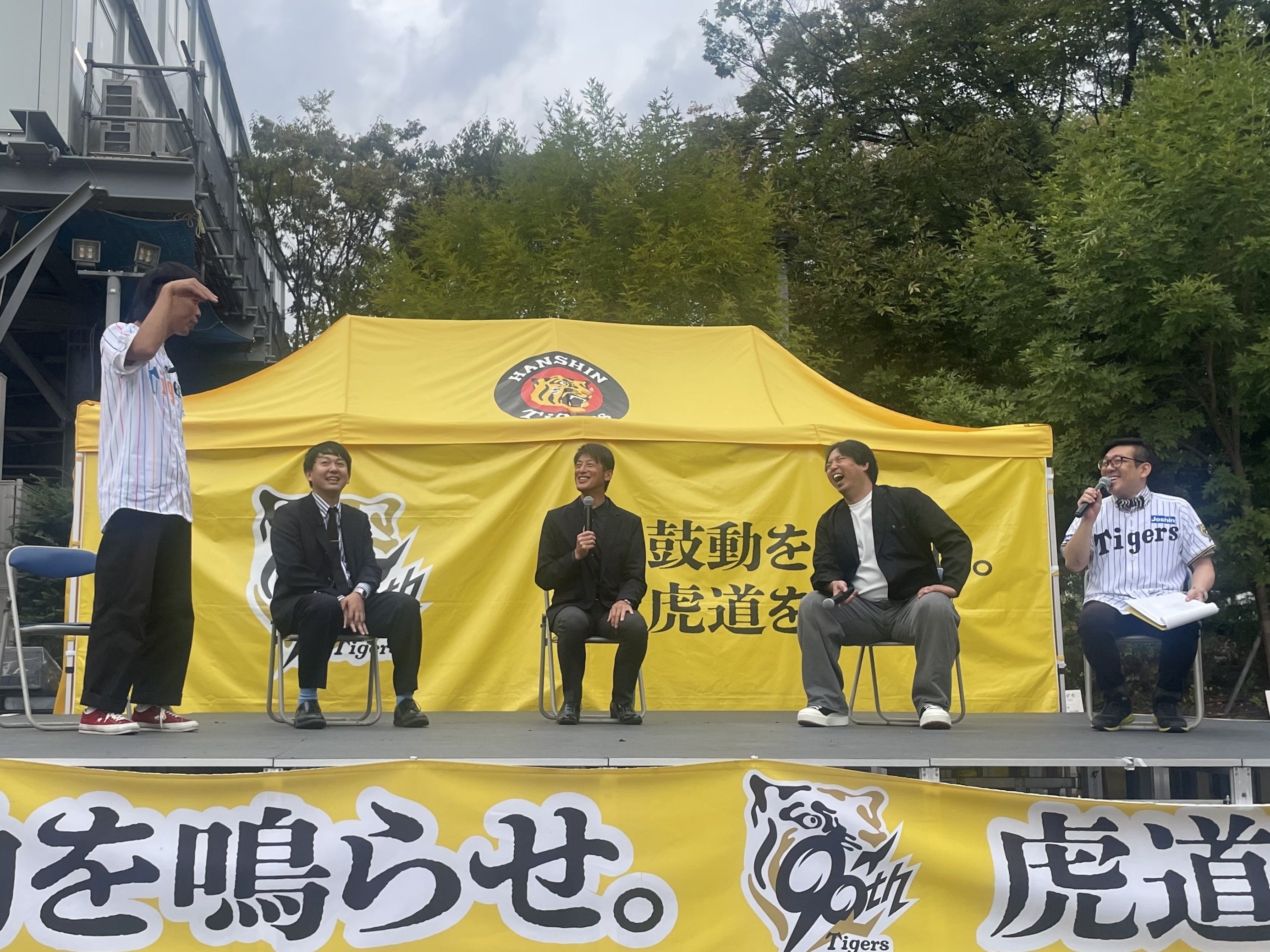 試合前には漫才と阪神タイガースOBの能見篤史さん、井川慶さんを迎えたトークショーを実施。漫才では「各球団のファンの特徴」と野球愛あふれるネタを披露。トークショーでは、「本日の試合結果の予想」や「ファーストピッチへの意気込み」を語り、観客の心をしっかりと掴みました。