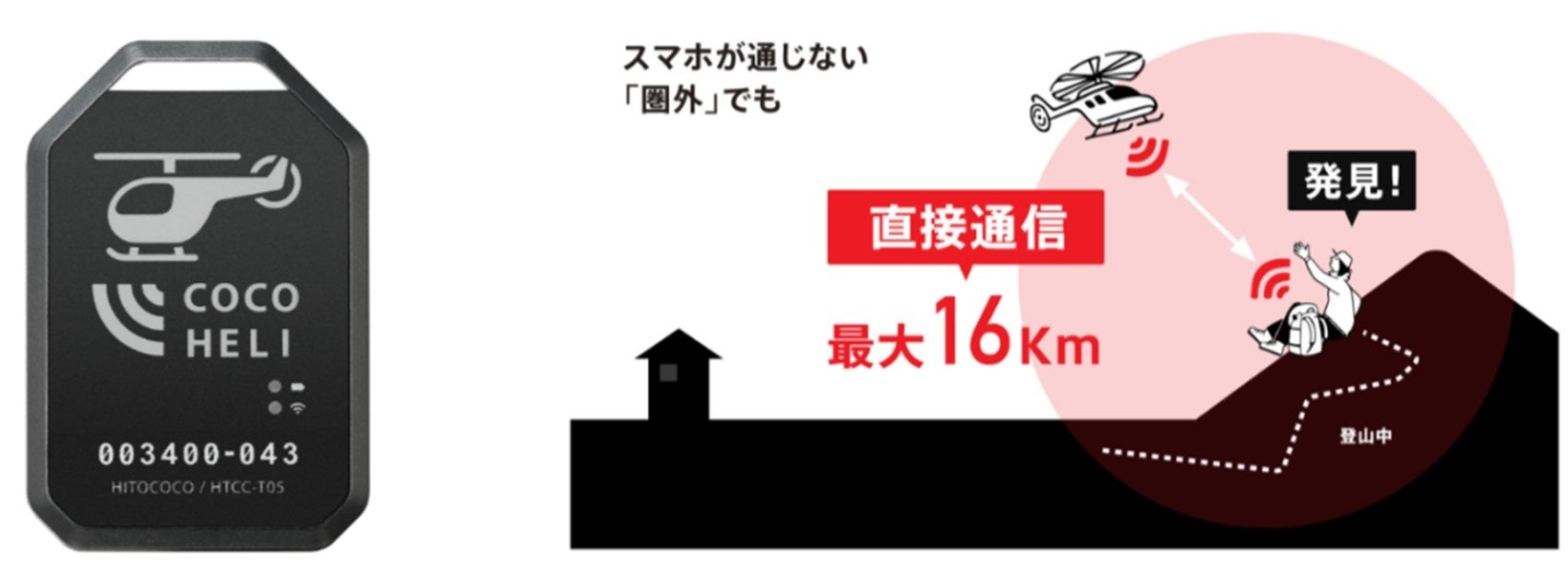 山域においては、スマホの「通信圏外」や登山者のケガ・死亡により「通信不能」となるケースが発生しています。ココヘリでは、会員に貸与される専用の発信機を活用し、様々な状況においても自分の位置を正確に捜索・救助機関に伝えることができます。また、全国の捜索ネットワークを駆使し、警察・消防と連携しながら、提携している民間ヘリコプター・ドローン、または地上からの捜索を実施しています。